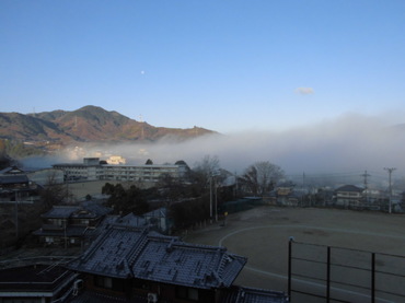 1 濃霧・・・今朝は紀ノ川に沿って広範囲に濃霧が発生しましたが、学校校舎から山側には霧がかからず、まるで雲の上にいるような状態になりました。
